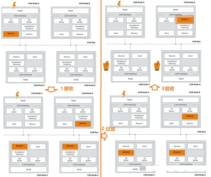 信息广播就如:节点A发送一条ID 0x12的信息,然后节点B,C,D都能收到。