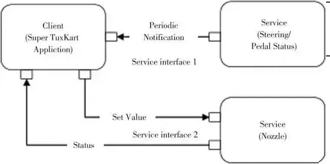面向服务的部分:在这部分中,“Super-TuxKart”应用程序被描述为1个服务消费者组件(客户端)。消费的服务是喷油嘴服务(Nozzle)和转向/踏板状态服务(Steering/Pedal