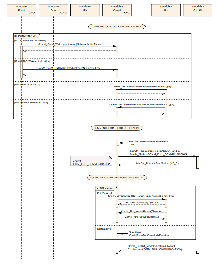 然后ComM模块会去调用CanSM_RequestComMode(如果是eth, flexray,则调对应eth和flexray的接口),让Can协议栈有收发消息的能力,返回OK的话,ComM就从刚才的No