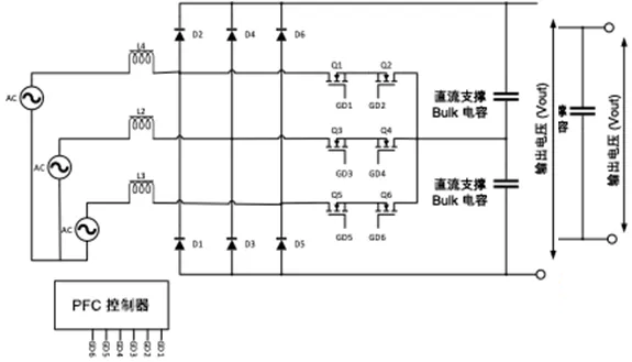 对于 3 相 OBC 模块,可采用 Vienna 整流器和 3 或 4 桥臂桥式 PFC(图腾柱)拓扑结构。3
