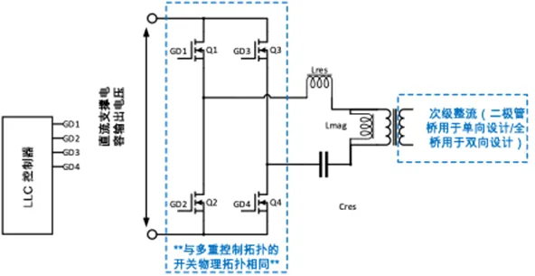 (DAB),但它实际上包括原边和副边整流,用于双向设计。 对单向系统来说最常见的解决方案是 LLC,而双向系统则是