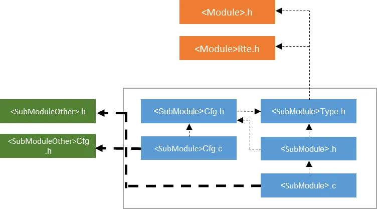实际运用时,可以只需要在该Module的Rte头文件中包含必要的<Module>.h文件,及使用extern关键词引用相应的接口函数或者配置即可。这样可以极大避免模块之间的紊乱的调用关系。