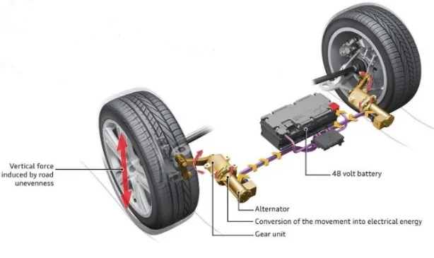 功能:该系统利用车辆行驶时悬架的上下运动来产生电能,通过一个电动泵和液压系统将这种机械能转化为电能,并将其存储在车辆的电池中。