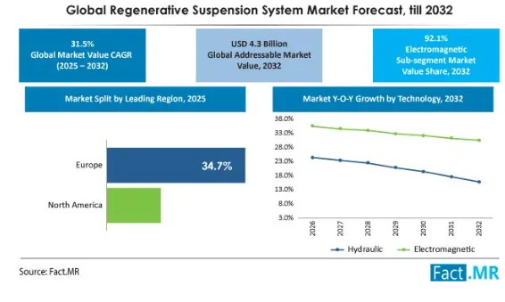 再生悬挂系统市场预计在2032年之前将显著增长,得益于电动汽车销量的大幅增加,特别是在欧洲和美国市场。随着电动车的普及,研究和开发方向也在向提高能量产出转变。由于再生悬挂系统组件成本较高,预计最初将在高端电动车中部署,随后逐渐扩展到其他车辆类型。