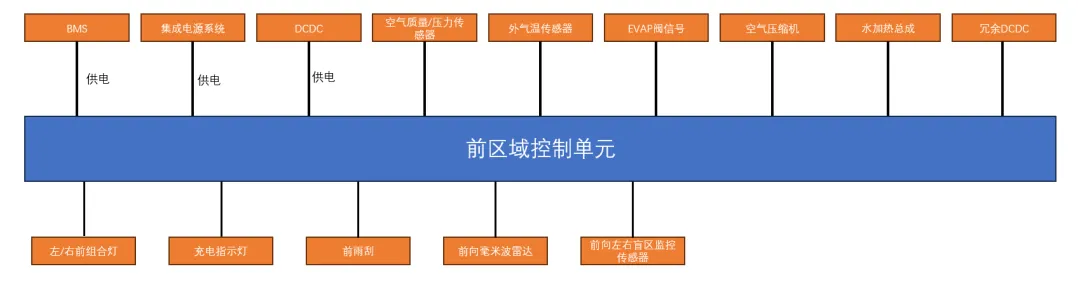 智能区域控制器包括三个,其中前智能区域控制器为车辆前部的传感器供电,包括毫米波雷达、超声波雷达、激光雷达、集成制动控制器等,另外通过LIN线与雨刮、水暖PTC、前蓄电池进行通信,具体前智能区域控制器的电气图如下所示。