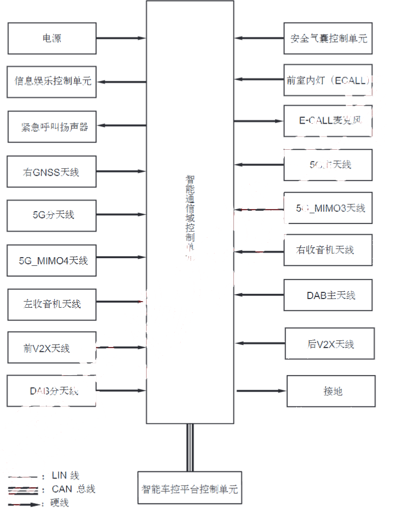 智能通信域控制器是基于T-box发展而来,但是相较于T-box,复杂度显著提高。集成了GNSS天线、收音机天线、5G天线,甚至还预留了V2X天线,这个在其他主机厂的车型上是没有见过的,具体的智能通信域控制器的系统图如下图所示。