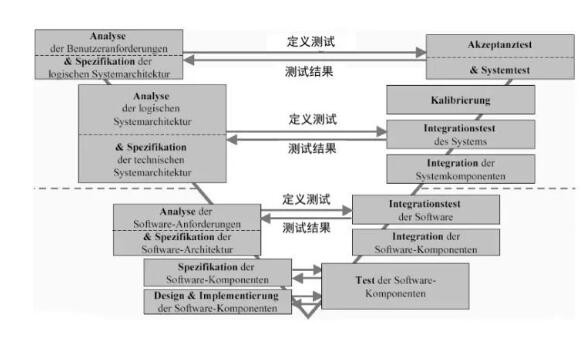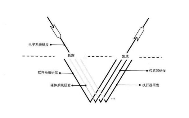 首先,如上图所示将电子系统研发拆解为软件系统、硬件系统、传感器和执行器研发四大部分,经过 V模型 流程研发,最终再次集成。这个V模型涵盖了从系统层面到软件层面以及集成后的功能测试和系统测试等流程,是当今汽车行业广泛应用的开发流程。因为其形状如字母V而因此得名。 下面将以下图所示的软件系统开发为例,分步骤介绍V模型。