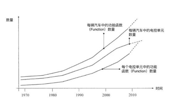 从上图可以看到,以奥迪为例,汽车各大系统的软件功能逐年快速增长。软件系统越做越大,越做越复杂,硬件系统跟着齐头并进。 在这些硬件数量爆发的背后,究其根本原因是汽车业需要满足客户逐渐提高的驾驶性和舒适性需求,同时要满足一系列汽车安全性能行业标准。 下图可以看到软件系统最小单元“功能函数”的总数随着时间推进,迅速增长。但是电子控制器的数量却在2010年前后开始放慢增长。这是因为越来越多的控制器,急剧增加了整车成本。整车厂面对成本压力不得不开始考虑应对策略,逐步将小型控制器集成到一个大型控制器。汽车电子系统从分散化转向集中化,减少控制器数量,降低总线长度,从而降低成本。
