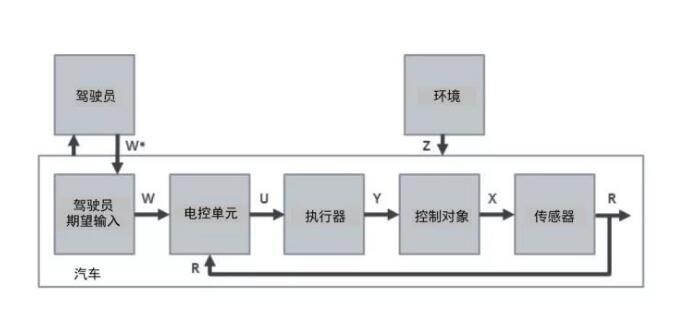 要理解为什么软件、硬件不能分家,只有组合在一起才可以组成汽车电子系统,我们需要首先搞明白汽车是如何与驾驶员和环境互动的。 下图是一个抽象出来的控制模型。驾驶员通过方向盘、踏板和换挡杆等给出期望(W*)操控汽车。这一系列实实在在、看得见摸得着的期望被转化为抽象的电子信号(W)进入电控单元。随后电控单元通过比较驾驶员期望(W)和传感器传回的当前实际值(R)进行对比。若对比发现,期望与现实存在差距,电控单元中的软件程序会通过逻辑计算给出指令(U)操控执行器做出响应(Y)。控制对象在执行器的动作和环境的影响(Z)下,开始做出驾驶员期待的反应(X)。这一反应(X)又会通过传感器监控、感知,当前状态(R)将再次返回电控单元完成控制闭合回路。