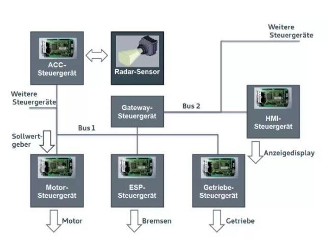 以上是一个十分简单的电控例子,只有一个电控单元参与其中。而现如今许多复杂的汽车功能常常需要由多个电控单元、多个传感器联合控制才能实现。 例如自适应定速巡航功能ACC,驾驶员通过设定期望巡航速度、与前车保持的期望距离等实现驾驶辅助系统一定程度上接管汽车的功能。这一功能就需要多个电控单元协作完成并且通过总线让它们随时保持通信联系。ACC控制器、雷达控制器、发动机控制器、ESP控制器、变速箱控制器、人机交互控制器以及数不清的传感器和执行器都将参与其中。 可以说,软件和硬件系统相互合作,共同为汽车创造出一个个新的功能奇迹。