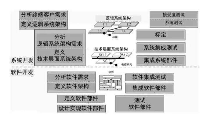 逻辑系统架构为定义具体的技术层面系统架构提供了基础。在这一步中开始讨论具体的技术问题,哪些功能将通过软件实现、软件块分装在哪些电子控制单元以及电控单元之间采用什么通信协议等等。软件系统初现雏形。 3、分析软件需求、定义软件架构