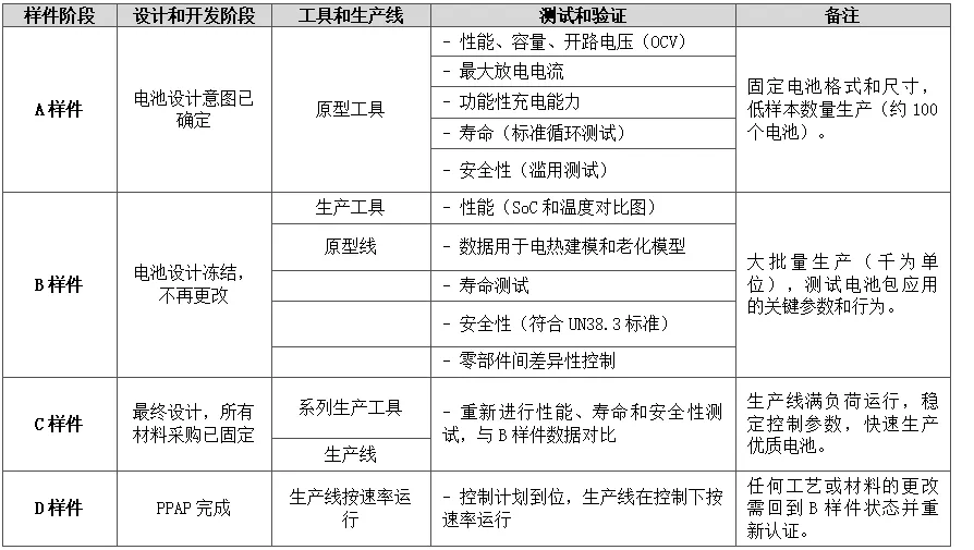 电池样件的成熟度由A、B、C、D四个阶段定义。这些阶段涵盖了电池设计、生产线开发和材料供应,是电池制造商与客户关系的关键。客户必须了解制造商的工作流程,才能对电池的设计、稳定性和质量充满信心。