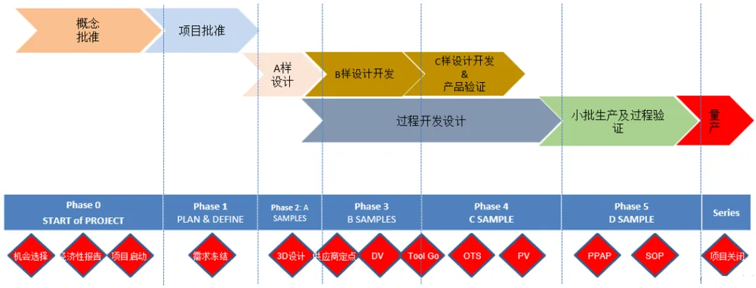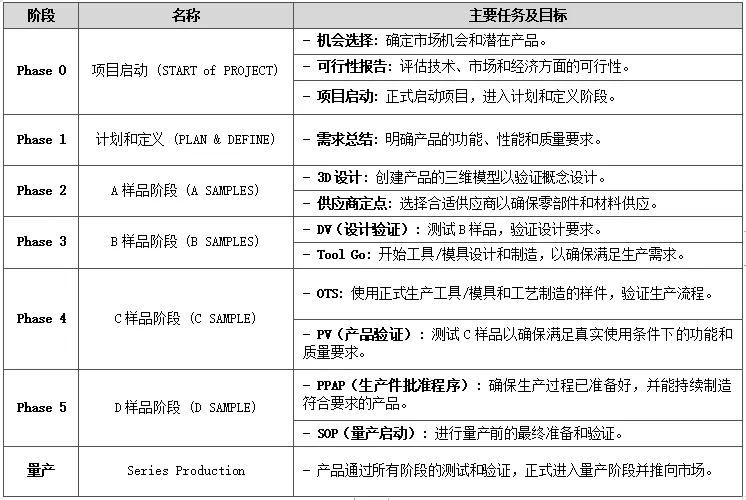 汽车零部件开发流程复杂且多阶段,涵盖从初步设计到最终产品上市的多个关键节点: