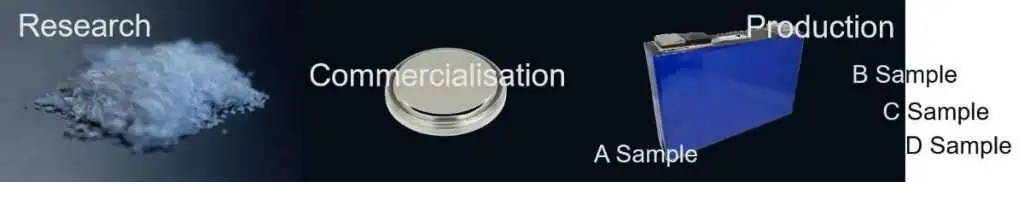电池的商业化开发通常会从小型纽扣电池或软包电池开始。一旦电池的格式、容量和活性层设计完成后,就会转向符合设计、尺寸和容量要求的电池。最初的少量电池仍然属于Pre-A样件,对客户没有价值。第一个能够提供一些基本特性的电池是A样件。