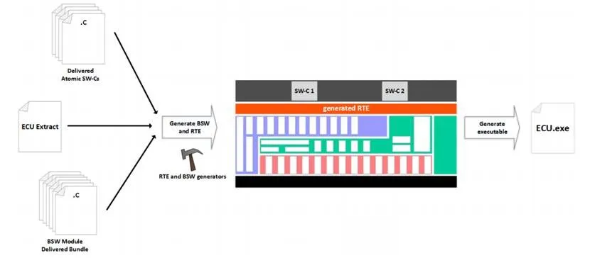 当BSW模块交付包、ECU提取和所有交付的原子软件组件可用时,ECU实例的集成就开始了。在此阶段,将配置ECU实例。执行顺序由调度任务和为这些任务分配软件组件运行表来定义。最后基础软件BSW配置完成,在生成RTE后,完整的代码将被编译并链接到一个可执行文件中。