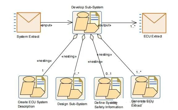 主机厂交付的系统提取文件中的软件组件结构可以被接收方转换为每个ECU不同的结构(ECU系统描述)。在这种情况下,主机厂的系统提取文件可以认为是需求,由一个或多个ECU系统描述表示的接收组织的子系统可以视为解决方案,它必须满足交付的需求。