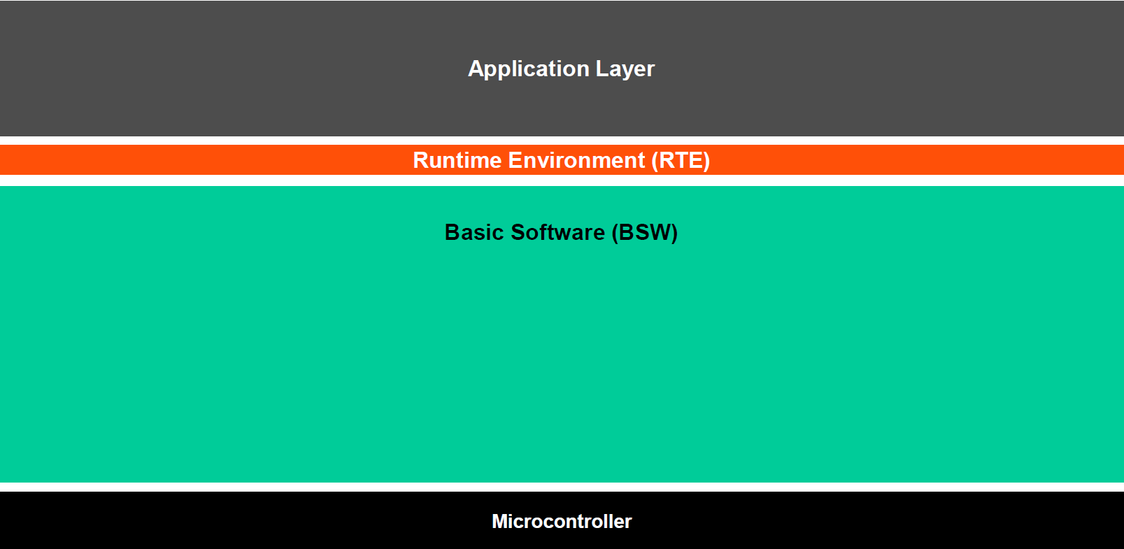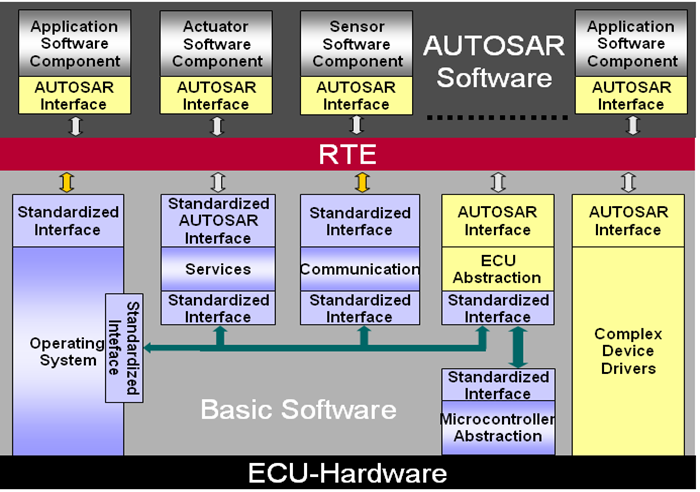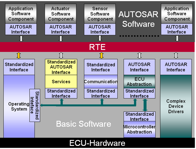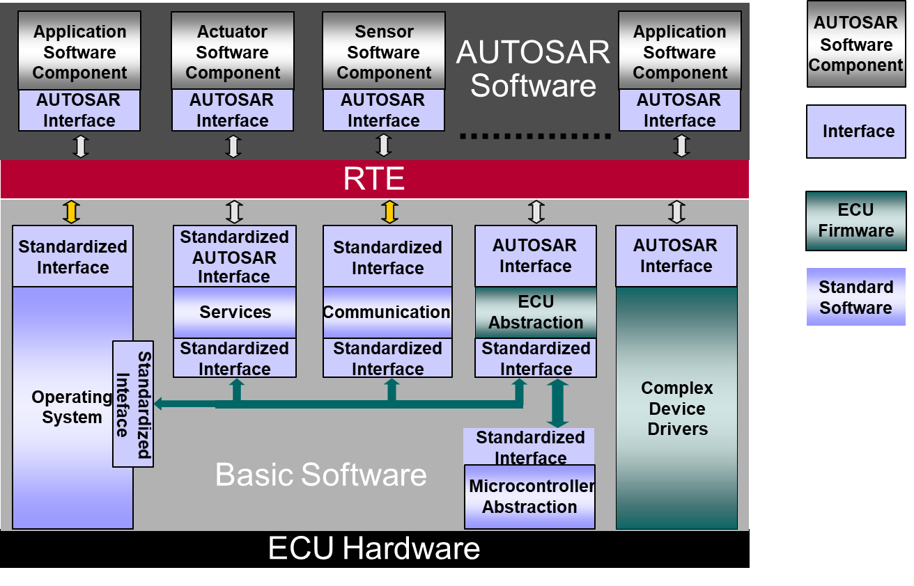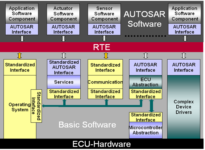 整个架构实现了软硬件的分离,通过标准化接口与模块化设计,保证了软件的可移植性和硬件的无关性。RTE作为核心中间层,统一了软件组件与底层功能之间的数据流与功能调用,提升了系统开发的标准化与高效性