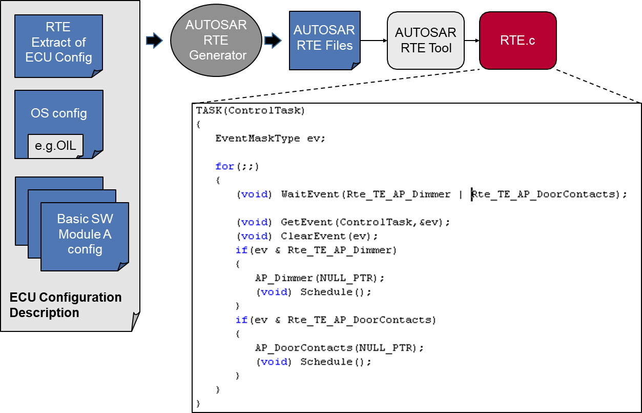 - 在操作系统接口方面,RTE通过Schedule和WaitEvent等API实现任务调度与事件管理;