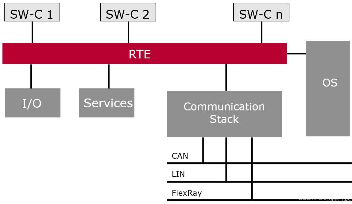 等软件组件会通过它连接到系统的I/O模块、服务模块、通信栈和操作系统(OS),且它通过硬件抽象层与通信栈支持CAN、LIN、FlexRay等通信协议,借助操作系统实现任务调度和管理。同时,RTE作为中间层屏蔽了硬件细节,提供标准化接口,让软件开发更高效、灵活,保障了软件的可移植性和平台独立性。