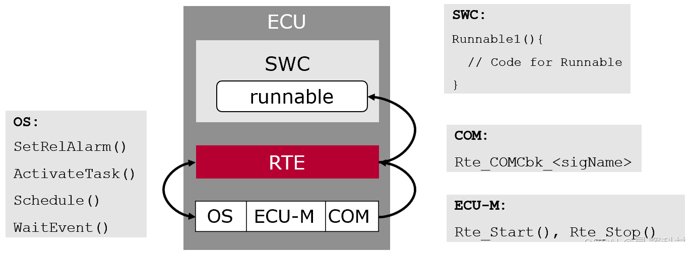 - 在ECU管理接口方面,RTE通过Rte_Start和Rte_Stop实现ECU的生命周期管理。