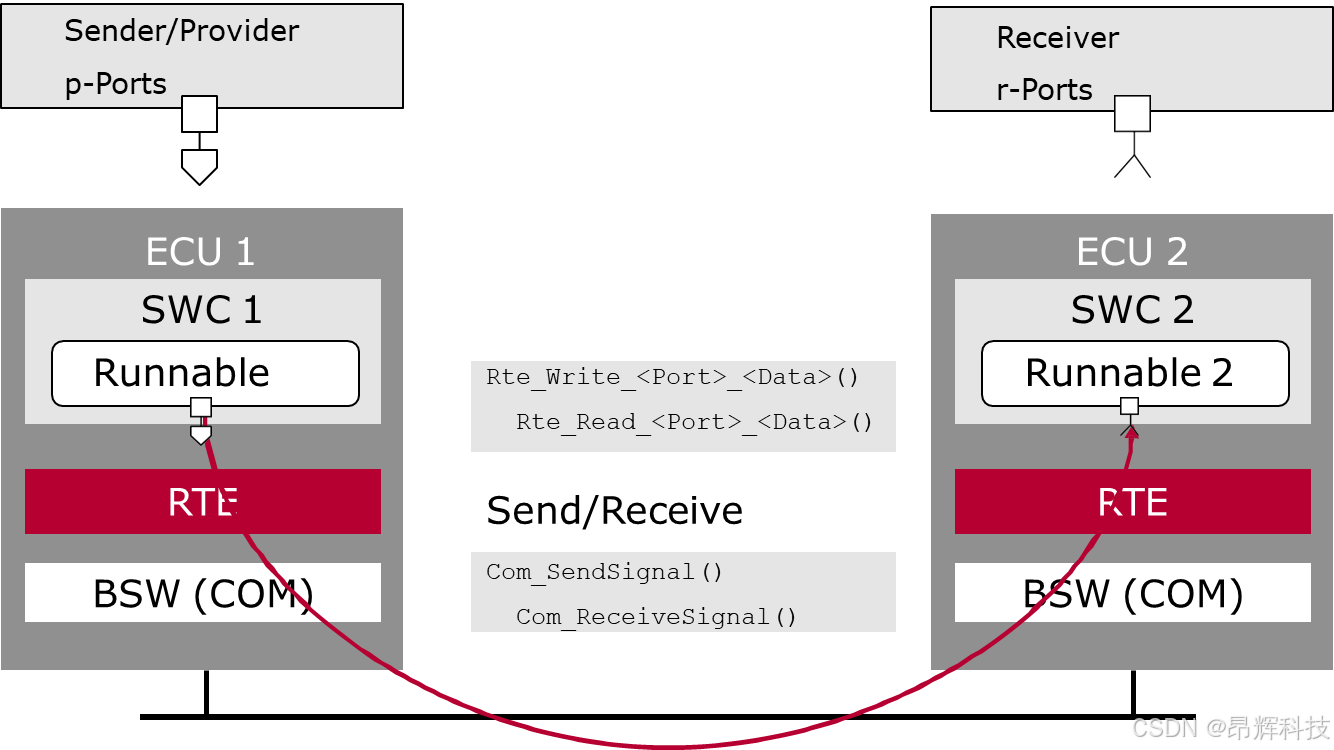 RTE实现了ECU之间的软件组件通信,具体通过Sender-Receiver机制进行。左侧的ECU