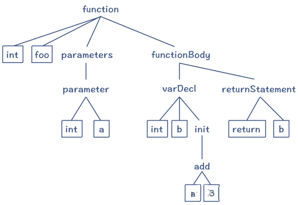 语法分析,根据语法规则将词法单元组合成语法结构(如表达式、语句、函数、模块),构建抽象语法树。