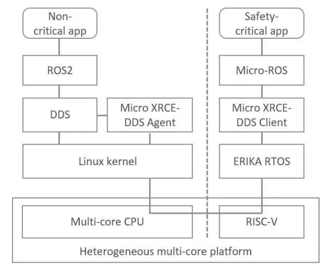 此前,已有研究提出将多操作系统与开源硬件架构相结合,应用于汽车和航天领域,但这些研究往往依赖对称/异构多处理器(SMP和HMP)芯片,需要虚拟机监控程序(Hypervisor)支持多操作系统运行,且采用闭源硬件架构和专用软件库实现操作系统间通信(详见第2节)。本文提出了一种面向汽车领域的软硬件技术栈,该技术栈同时利用非对称多处理器(AMP)和基于RISC-V的硬件,旨在构建一个基于汽车领域常用中间件的汽车开放平台。具体而言,本文的贡献包括以下几个方面:
