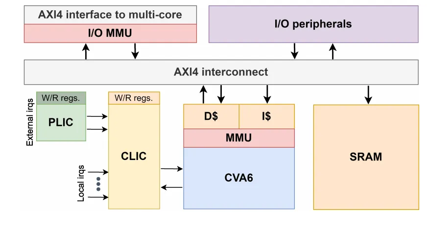 在嵌入式领域,通用核心的实时性能在很大程度上取决于其中断控制器的设计。对于汽车领域的安全关键型和时间关键型系统而言,这是一项至关重要的功能需求,因为这类系统需要尽可能减小中断延迟和上下文切换时间。然而,CVA6在中断处理方面存在以下不足: