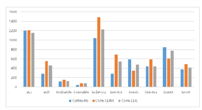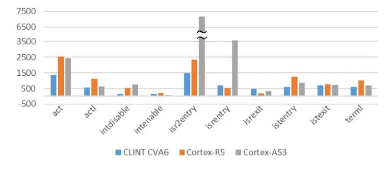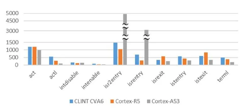 Cortex-R5)的测量结果更为接近,此前的性能峰值(如actl和isrentry测试)已显著降低。此外,在4项指标(即act、isrentry、istentry和istexit)上,实时操作系统(RTOS)所需的周期数等于甚至低于Cortex-R5。这些实验结果证实,RISC-V是运行下一代汽车微控制器(MCU)的AUTOSAR