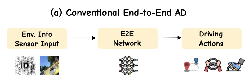 ● 端到端自动驾驶: 为解决模块化流程的弊端,端到端(E2E)方法直接将原始传感器输入映射到控制指令。这种方法简化了系统,但依然存在挑战:难以处理罕见场景和快速变化的场景、过程“黑盒”缺乏可解释性造成安全验证困难、缺乏语言理解能力导致人机交互受限制。