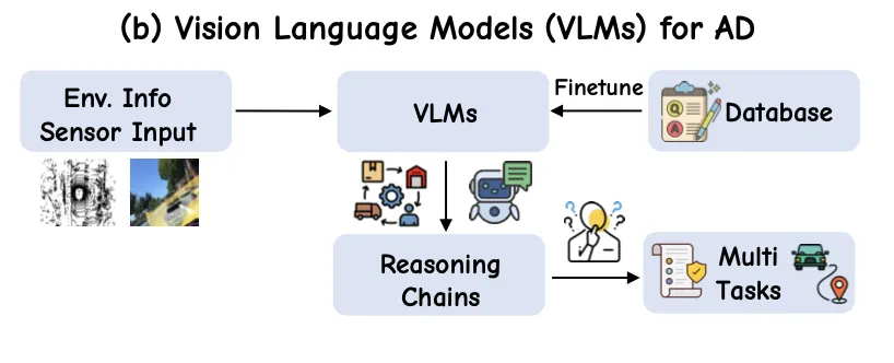 自动驾驶技术已从经典的模块化设计演进到端到端学习,再到引入视觉语言模型(VLM)以增强推理能力。VLA4AD引入了大语言模型能力,使车辆能够遵循高级指令(如“给救护车让路”)、输出决策过程(通过思想链推理),并利用大语言模型从大规模数据中获得的常识来处理罕见或从未遇到过的场景。