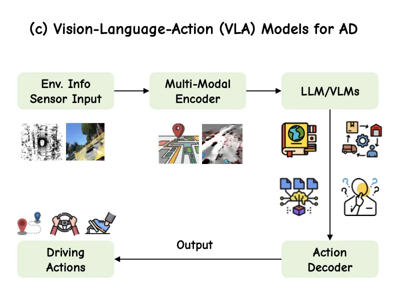3. 统一的端到端 VLA 模型: 随着大型多模态基础模型的出现,研究转向了将传感器输入直接映射到驾驶动作的统一网络。例如,SimLingo