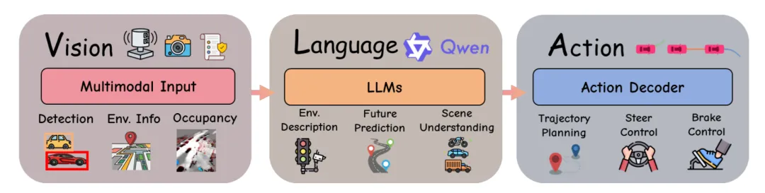 3. 行动解码器: 负责生成驾驶决策。其实现方式包括: