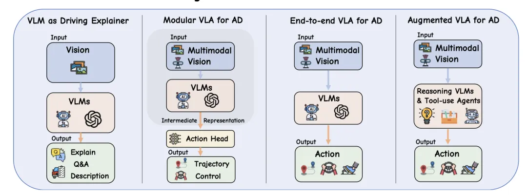 从左至右展示了四个阶段:VLM作为解释器、模块化VLA、端到端VLA和增强型VLA。