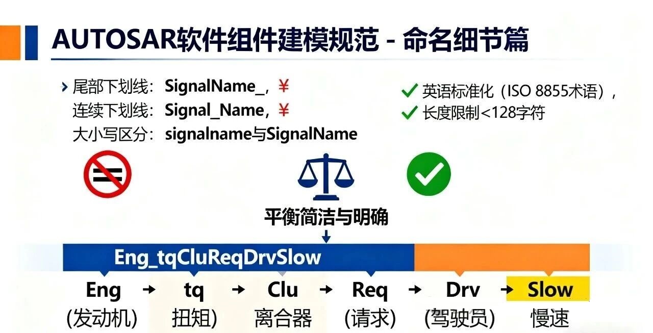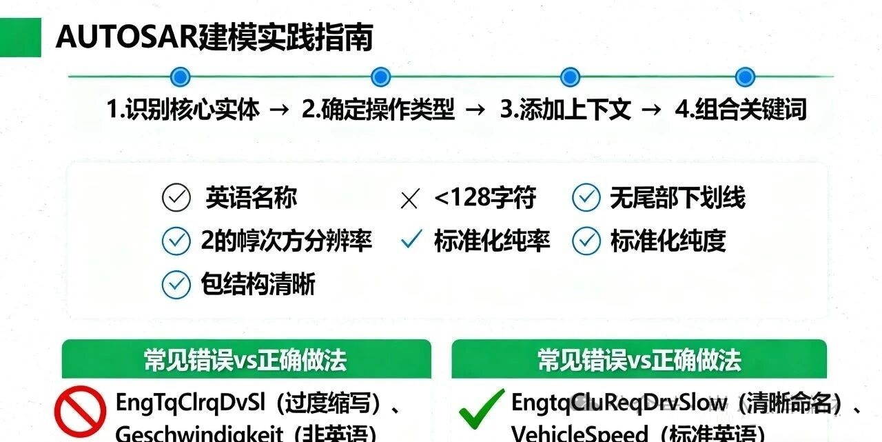 想象一下,如果你的同事给变量命名为"a"、"b"、"c1",你会多么困惑!在AUTOSAR模型中, 良好的命名习惯是高效协作的基础 。