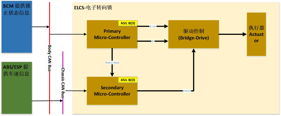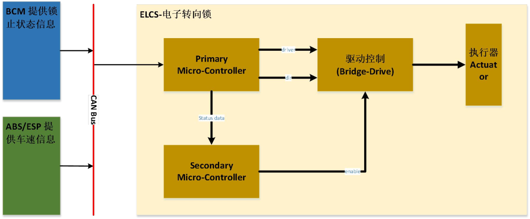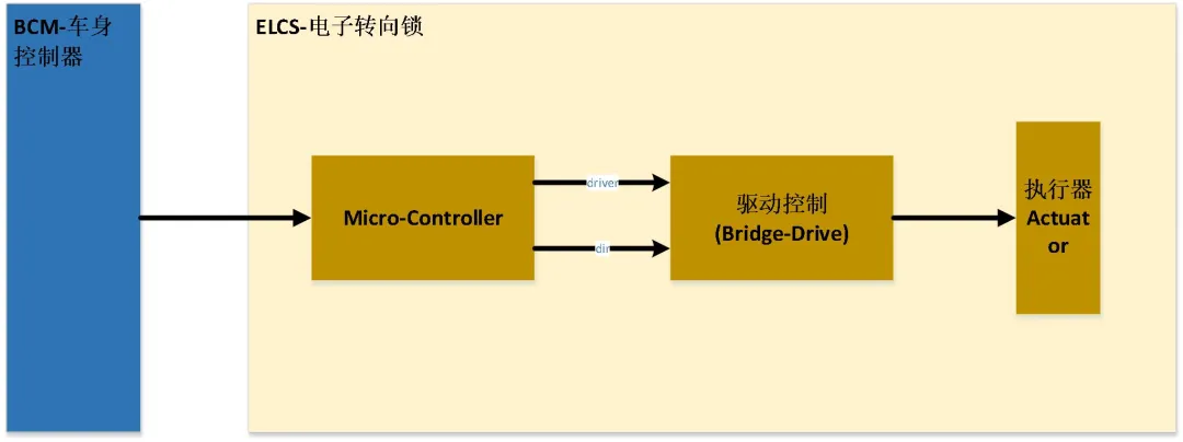 下图是该功能的简单架构,其中车身控制器通过CAN通讯与MCU进行信息交互,MCU进而通过控制执行机构来将转向锁锁定。