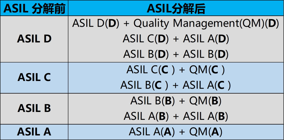 下图展示了ASIL分解符合ISO 26262 Part9中的组合。