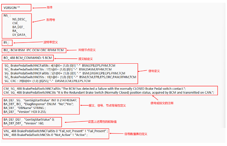 使用CANdb++ (推荐) 打开: 移步:【安装手册】CANdb++ Editor || 【使用手册】CANdb++Editor 使用记事本或**nodepad++**打开: 一个标准CAN帧中包含的信息有,消息ID、报文发送周期、 报文长度、信号信息等。