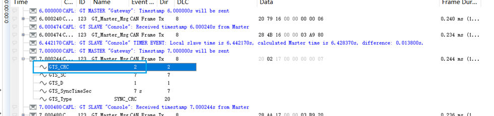 根据dbc文件中的定义 我们来计算一下 GTS_CRC 这条信号对应的值。 这个信号对应的 StartBit 是8 , length为 8, factor: 1 , offset(偏移量):0