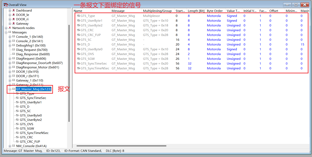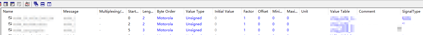 简单介绍一下CANdb++展现的报文信息,详细见文首CANdb++使用手册。 可以通过信号中的定义信息的信息来解析上面的报文值。