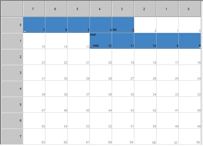 Intel格式跟小端格式一样,低地址代表低字节,高地址代表高字节。 比如一个信号Intel,它的起始位为3,长度为10,在dbc中它的排列顺序如下所示: