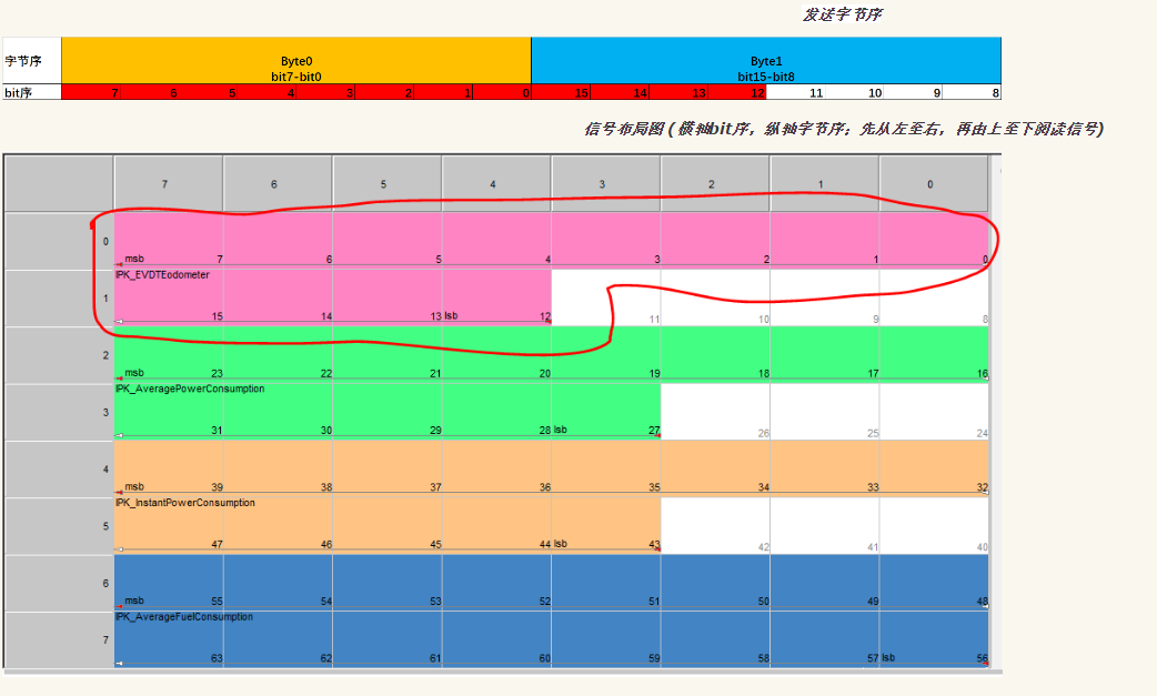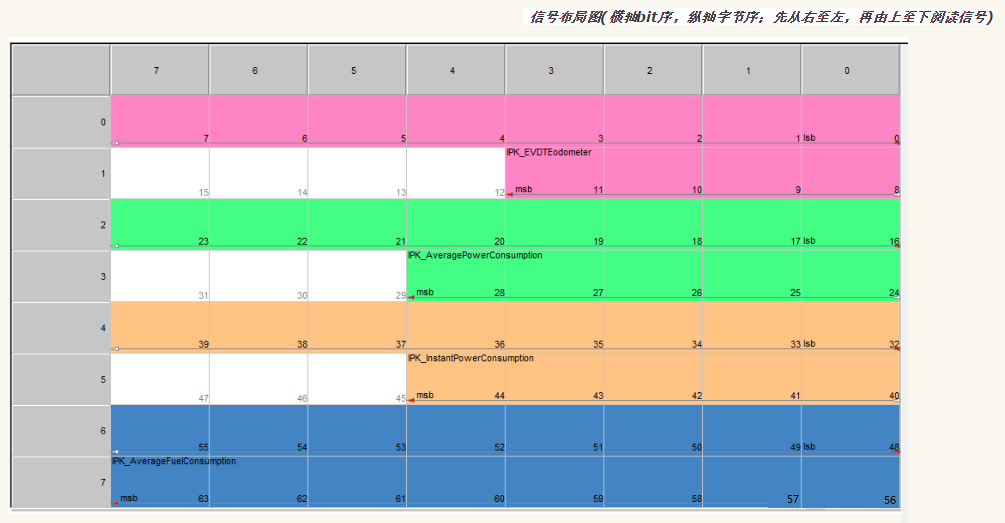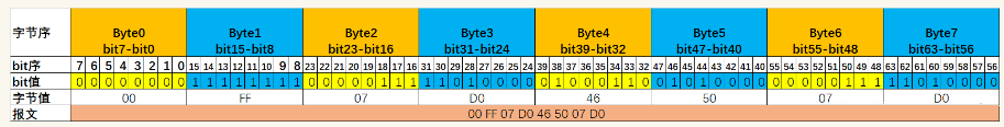 开始解析前,先了解一下报文帧。 下表体现了摩托罗拉字节位序的报文发送时的字节序和bit序,一会儿可以帮助我们理解dbc中的定义: