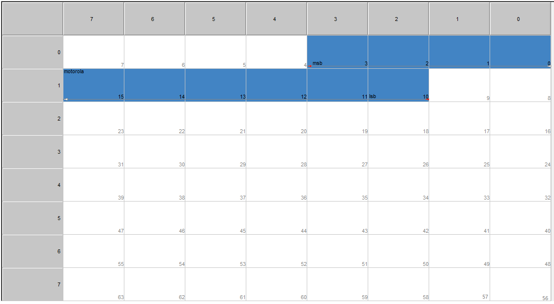 Motorola格式跟大端格式一样,低地址代表高字节,高地址代表低字节。 与Intel不一样,Motorola格式有2种表达方式,一种是Motorola_LSB,另一种是Motorola_MSB,但实际上它们代表的数据结构是一样的,只是表达方式不一样而已,其中Motorola_LSB的起始位是从低字节开始的,而Motorola_MSB的起始位是从高字节开始的。 在dbc中,比如一个Motorola_LSB的信号MotorolaSignal,其起始位为10,长度为10,在dbc中,其排列顺序如下所示: