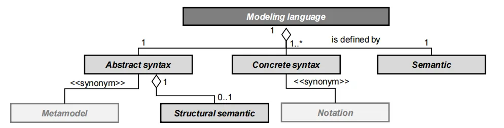 如前所述,要基于模型描述系统,就需要一种建模语言(例如SysML)。如图1所示,建模语言由语法和语义定义。具体而言,建模语言包括抽象语法、一种或多种具体语法以及语义。抽象语法定义了不同的模型元素及其属性,以及与其他模型元素的关系。抽象语法(也称为元模型)还包含静态语义,主要用于定义模型元素和关系的约束条件。具体语法(也称为表示法)规定了图形化呈现方式。例如,可以定义系统元素用蓝色矩形表示。语义则在具体的模型环境中定义了模型元素的含义。