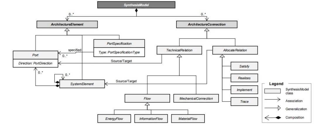 系统元素通过端口形式的连接结构与其他元素交互。端口具有方向,可设置为输入或输出。端口规格对端口进行更详细的描述。类型属性允许对端口进行分类,类似于对技术关系的分类。技术关系包括在各个系统元素之间流动的各种流,用于表示技术依赖关系。这些流分为物质流、能量流和信息流,且只能表示有向连接。一个特殊功能是能够专门对机械连接进行建模,这在安全方面尤为重要。例如,两个元素之间的机械连接被有意或无意破坏,可能会对整个系统的安全产生严重影响。无需通过端口即可建立分配关系。分配关系包括系统元素与系统模型中其他方面之间的“满足”、“实现”和“实施”关系。例如,可通过“满足”关系将安全目标(功能安全和网络安全目标)分配给负责的元素。“实现”关系将元素所实现的功能关联起来。通过“实施”关系,可将系统元素分配给物理解决方案元素(例如具体的控制单元)。危害和威胁的分配通过追溯关系表示。