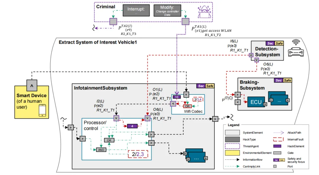 由于现代技术系统及其组件的功能集成和网络化程度不断提高,通信和网络接口数量急剧增加。这导致系统复杂度极高,在开发过程中,只有借助基于模型的系统工程方法才能将其掌控。开发过程中早期安全分析的重要性日益凸显。纯粹面向安全或纯粹面向网络安全的设计和防护,已无法满足不断增长的需求。例如,网络安全漏洞可能以薄弱环节和故障的形式累积,导致最小子系统出现错误,并在整个系统中引发不可预见的影响。为了在开发初期预判这些挑战并采取适当措施加以弥补,需要一种系统架构建模语言,能够跨学科对功能安全和网络安全特定方面(例如错误或攻击路径)进行建模。该建模语言是功能安全和网络安全综合或组合分析与防护的基础,能够尽早发现协同效应以及相互冲突的影响或目标,并通过适当方式加以解决。