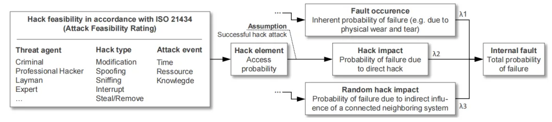 21434的攻击可行性评级来确定黑客攻击的可能性。该分析的输入是之前定义的威胁代理、黑客攻击类型和攻击事件等结构。此外,如果对相连的相邻系统发起或通过相连的相邻系统发起内部黑客攻击,系统元素的失效概率也可能因间接黑客攻击而增加(λ3)。如果攻击成功,将结合黑客攻击类型确定由黑客攻击导致的失效概率(λ2)。