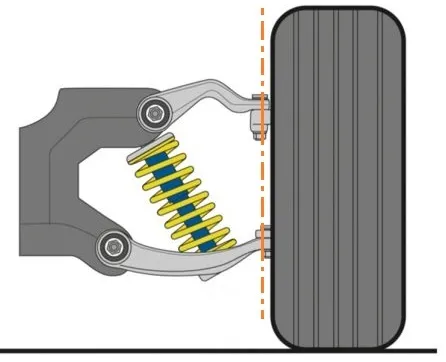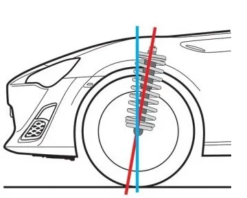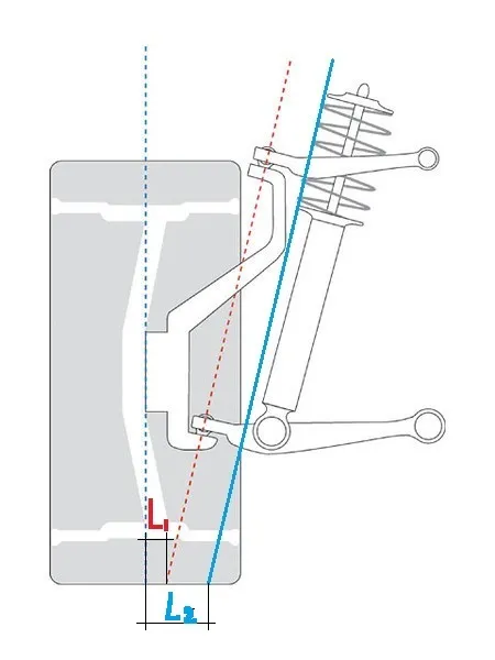 主销偏距举例,对于下图双叉臂悬挂,红色虚线设定的内倾角导致了一个比较小的主销偏距(L1),如果转向轴是由蓝色实线确定的(比如可以通过更改悬架参数做到,比如悬架上下控制臂都更短一些),则主销偏距(L2)更大回正更好。由于上段提到的原因,现代车辆一般倾向于尽可能小的主销偏距(内倾多在10-15°,主销偏距在+/-20mm内,考虑到前轮胎宽150-250mm)