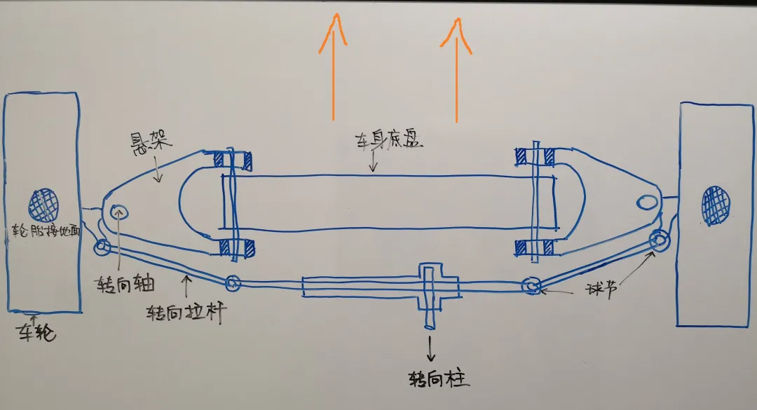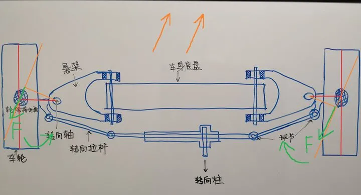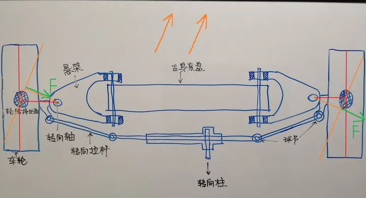 但不管用什么做助力,如果从车顶部往下看车的前轴,如下图蓝色箭头所示,