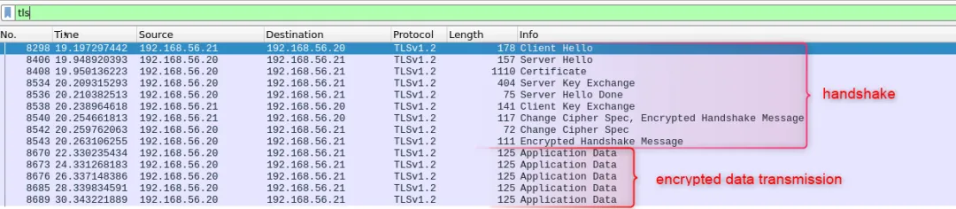 在系统运行过程中,TLS客户端(192.168.56.21)发现所需服务后,向服务提供方(TLS服务器)发送“ClientHello”消息,以启动安全连接。此消息中包含了客户端支持的TLS版本、加密算法组合(Cipher